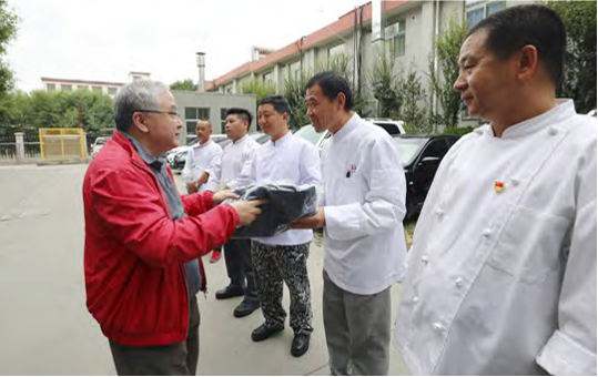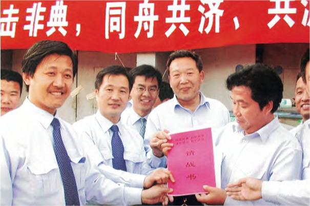 在“抗非典,谋发展”表彰大会上,党 委书记段强、时任总裁梅蕴新接受小汤 山解放军医务人员的锦旗和感谢信