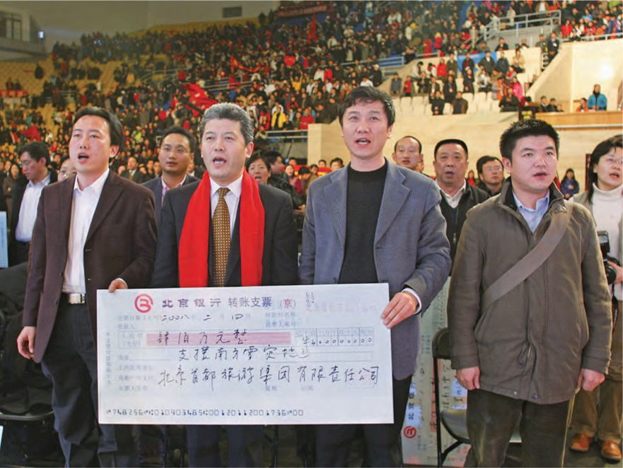 2008年2月,党委副书记、总经理 刘毅代表91影院员工和企业,为抗 击冰雪灾害捐款400万元